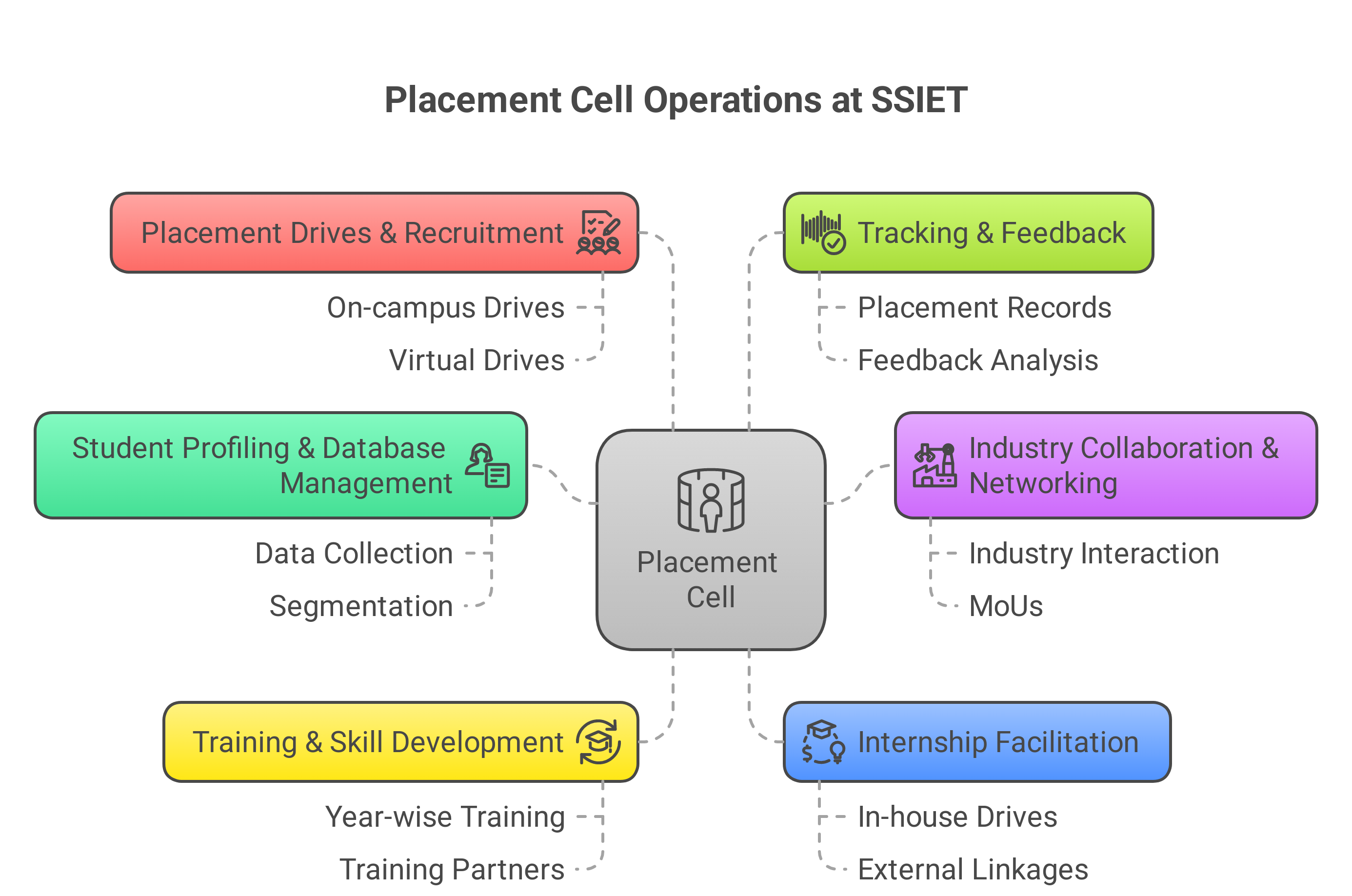 The Placement Cell operates through a structured approach that includes aptitude training, technical skill development, resume building workshops, mock interviews, and industry expert sessions across all semesters. It also maintains active engagement with top recruiters, alumni, and professional bodies to facilitate campus drives, pooled drives, and internship opportunities. With a focus on both core domain placements and interdisciplinary roles, the TPC ensures every eligible student is guided and prepared to meet evolving industry standards.